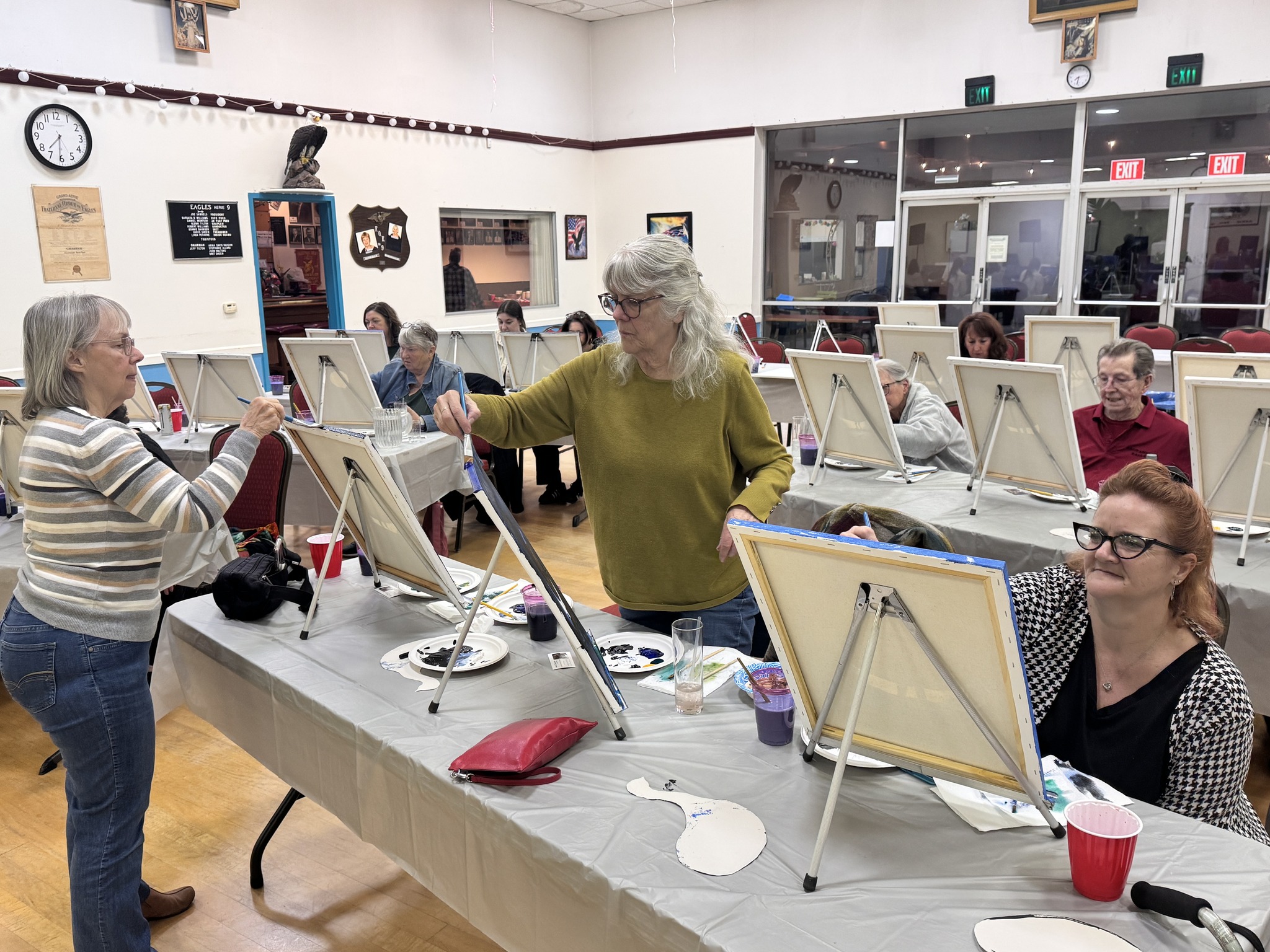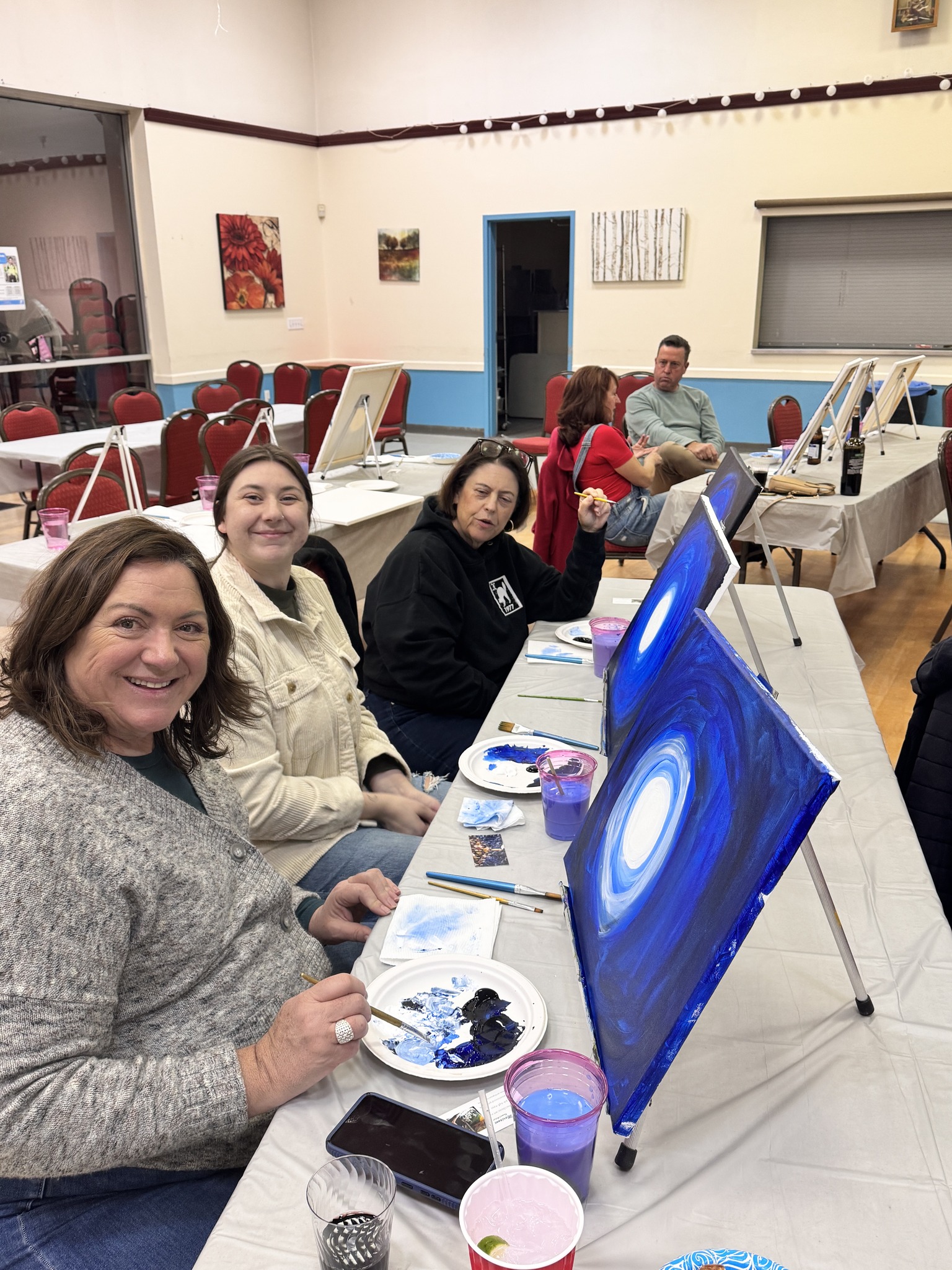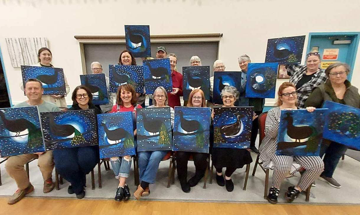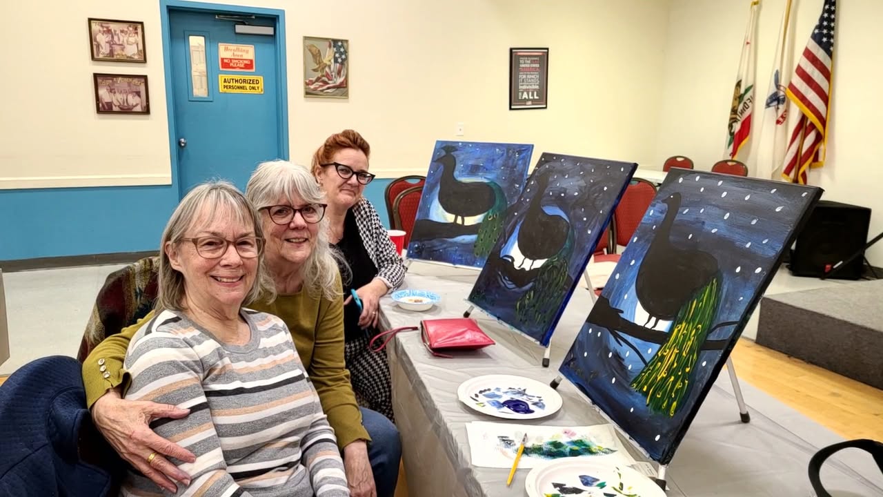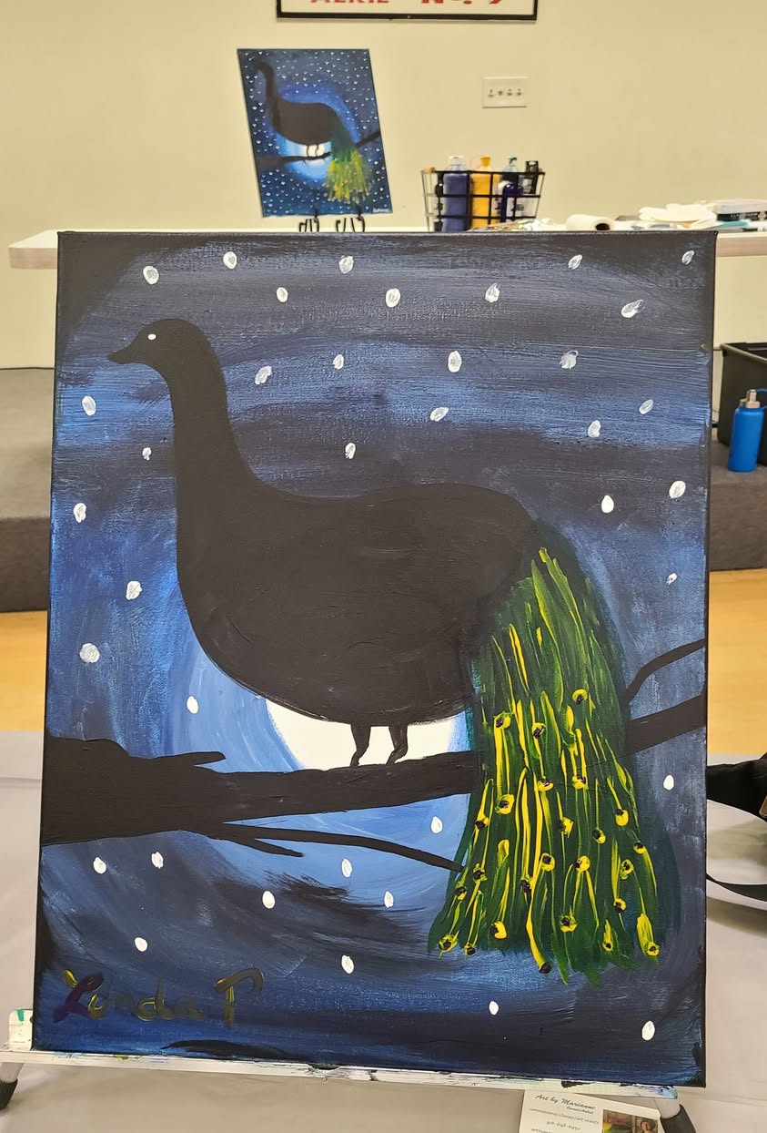 The entire group of artists Paint Night at The FOE #9. Feb. 8th 2025Sacramento artist Marianne Gonzalez brought out our inner Van Gogh. We all had a wonderful time with ArtbyMarianne.com. She provided guidance, technique and freedom to make the Peacock our own.