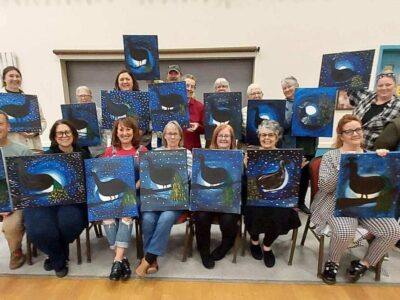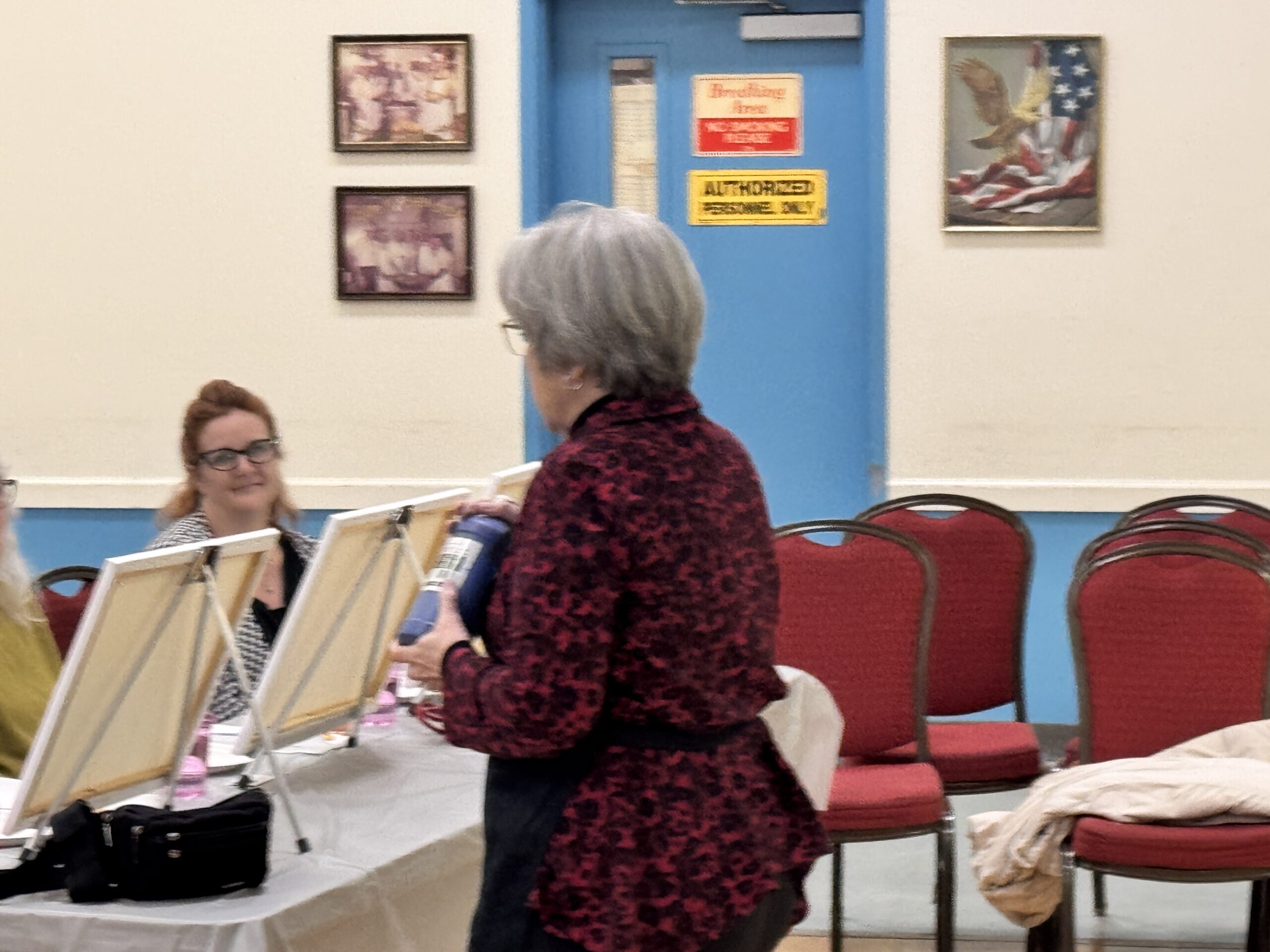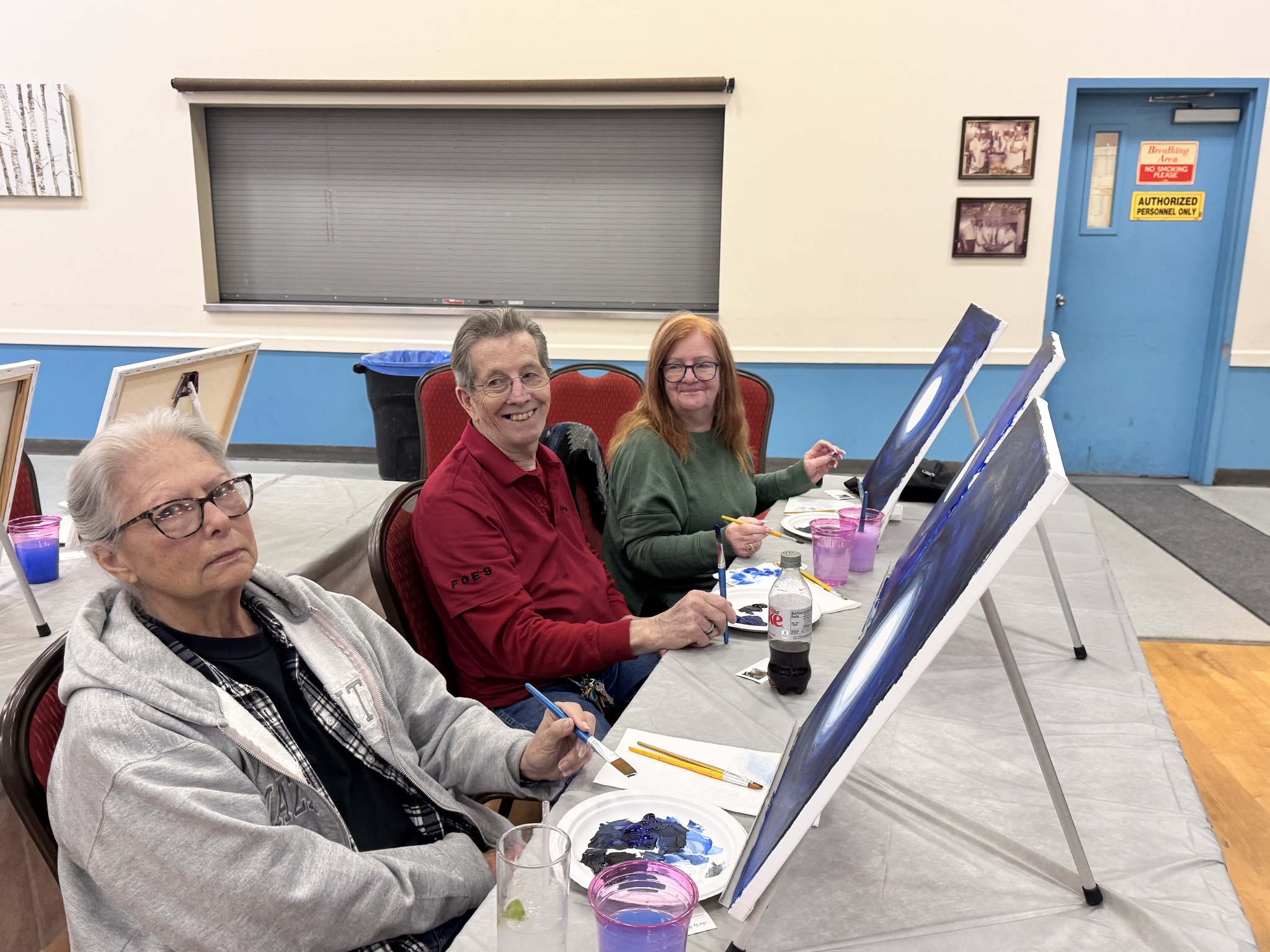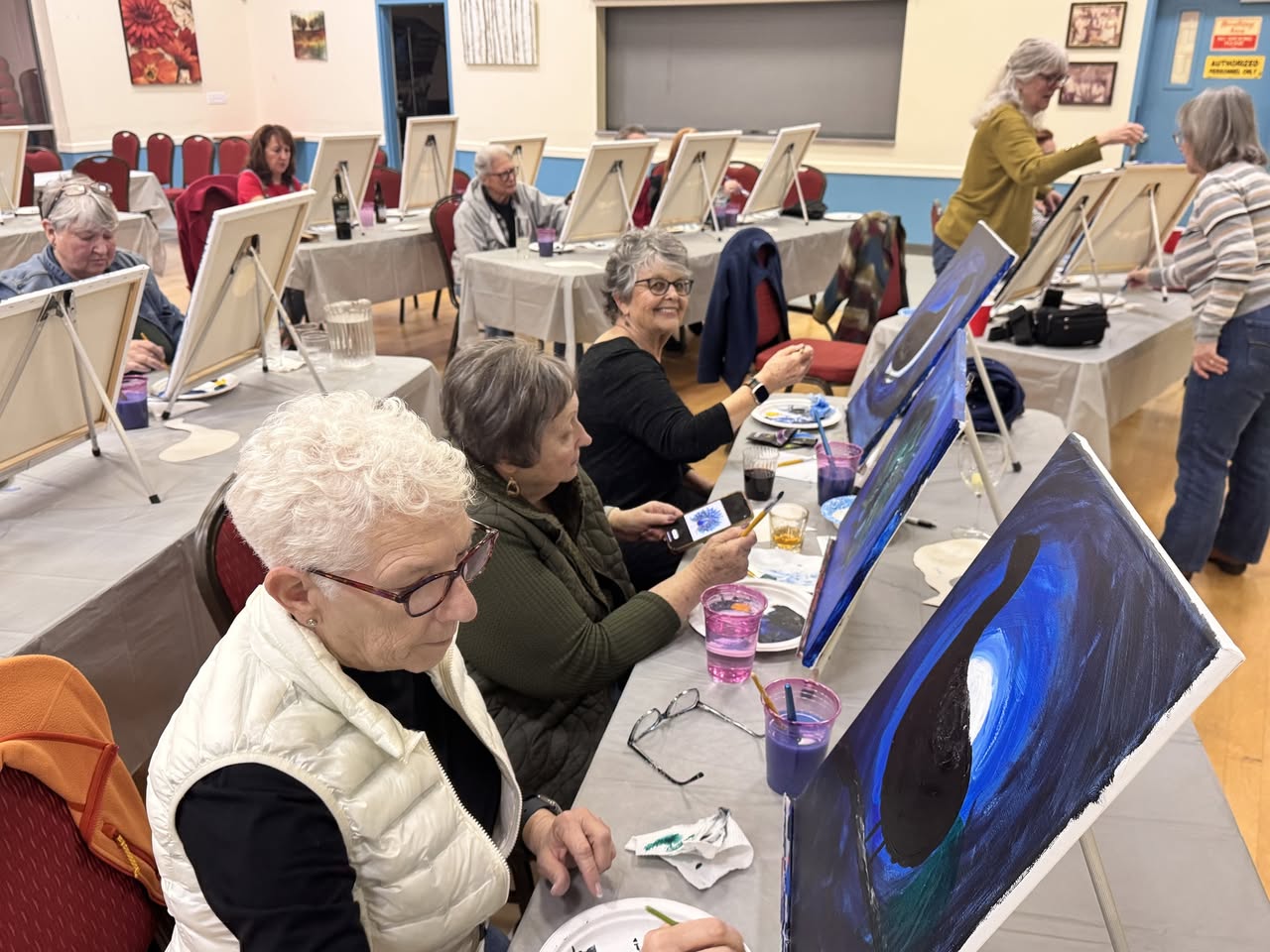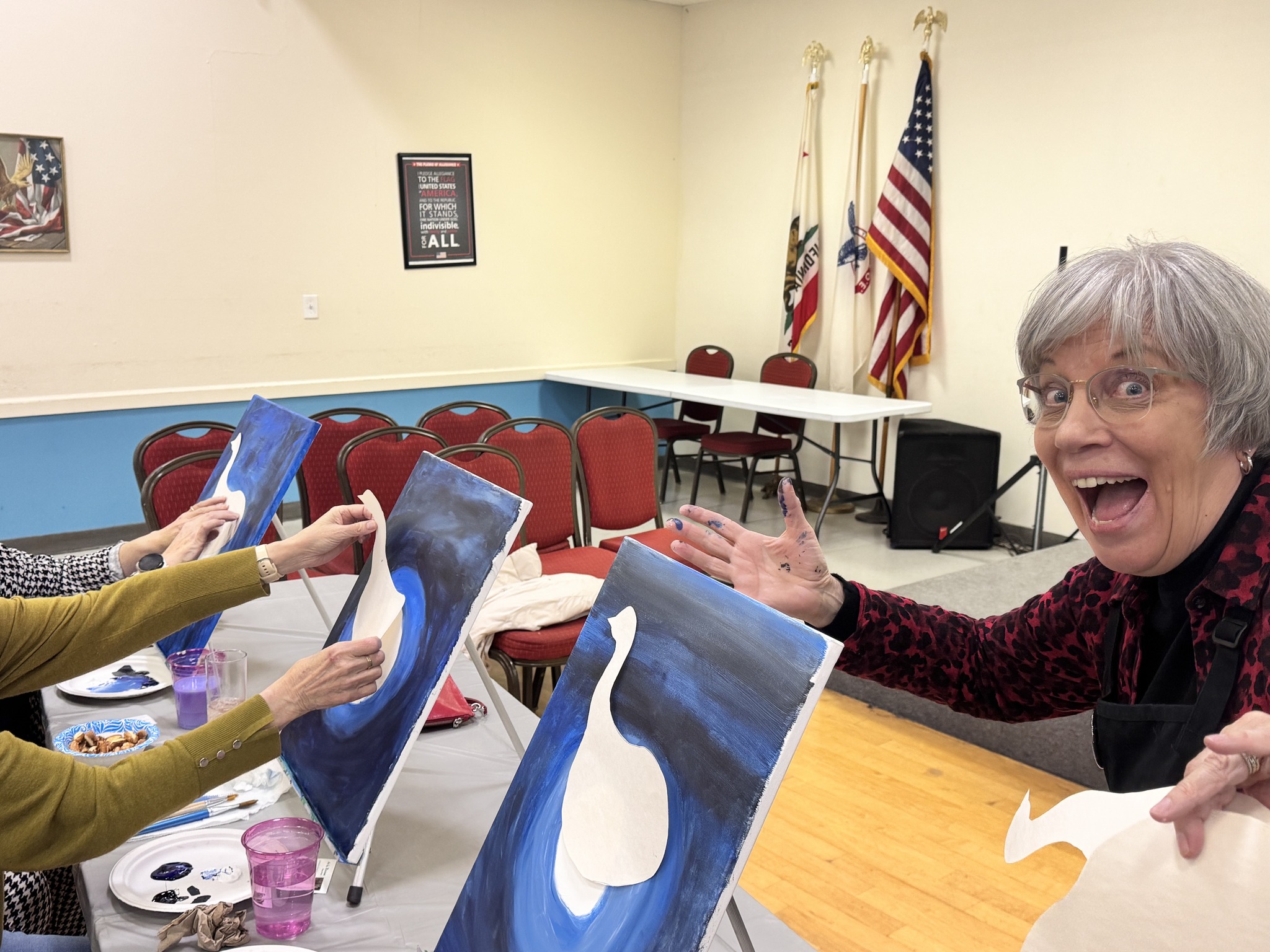 The entire group of artists Paint Night at The FOE #9. Feb. 8th 2025Sacramento artist Marianne Gonzalez brought out our inner Van Gogh. We all had a wonderful time with ArtbyMarianne.com. She provided guidance, technique and freedom to make the Peacock our own.