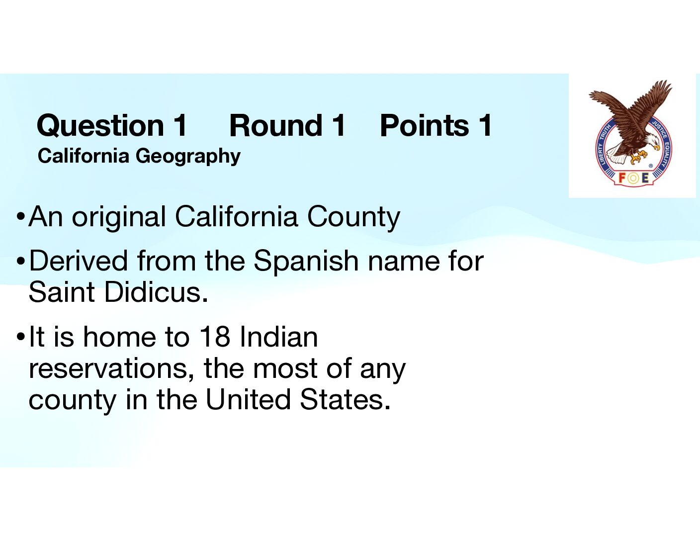We have 3 rounds of 10 questions with scoring after each round. Topics cover, California geography, music, movies, art, history, sports, current events and volcanoes.